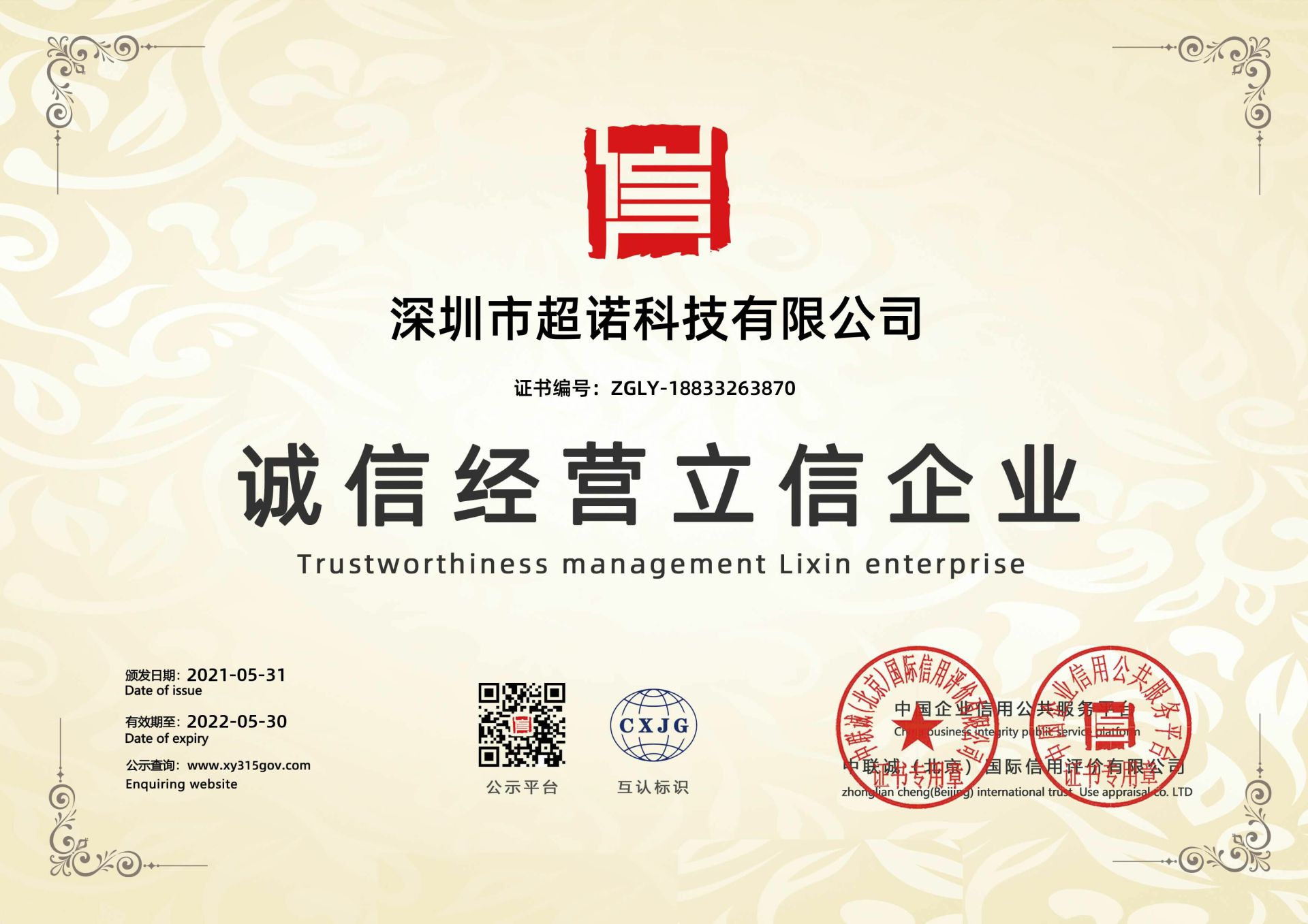 公司荣获诚信经营立信企业资质